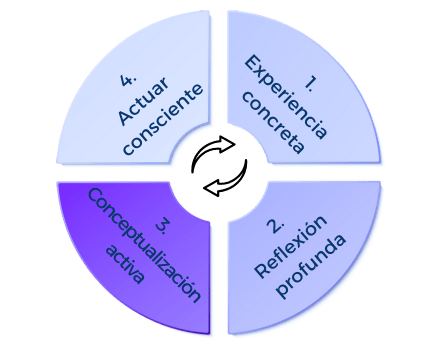 En Kairós Consutorías creemos que el aprendizaje significativo ocurre cuando las personas se involucran activamente en su proceso de desarrollo. Por eso, nuestra metodología se inspira en el modelo de aprendizaje experiencial de David Kolb, que propone un ciclo dinámico de cuatro etapas. Adaptamos este modelo para generar experiencias transformadoras, integrando reflexión, acción y propósito.