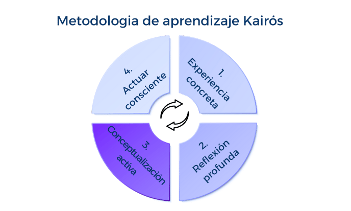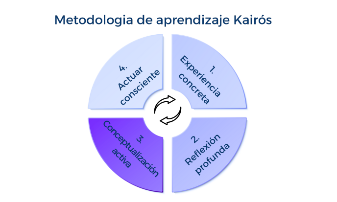 En Kairós Consutorías creemos que el aprendizaje significativo ocurre cuando las personas se involucran activamente en su proceso de desarrollo. Por eso, nuestra metodología se inspira en el modelo de aprendizaje experiencial de David Kolb, que propone un ciclo dinámico de cuatro etapas. Adaptamos este modelo para generar experiencias transformadoras, integrando reflexión, acción y propósito.